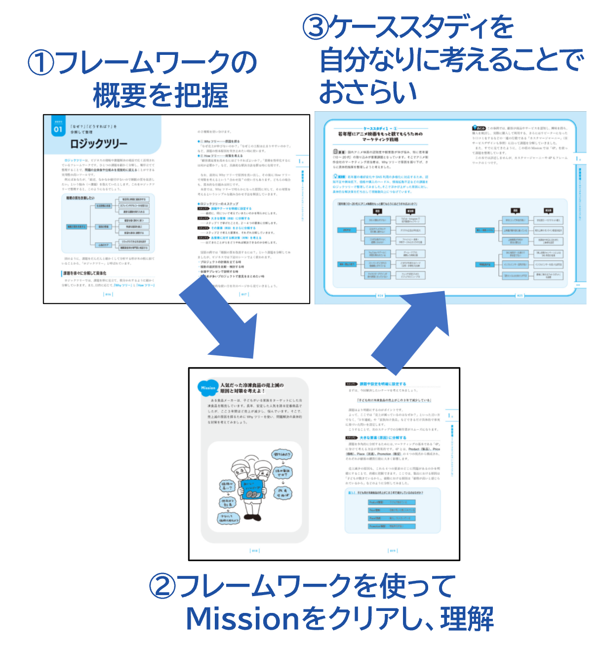 本書では、厳選した20のフレームワークを仕事の流れに沿った7つのプロセスに分け3段構成で解説。