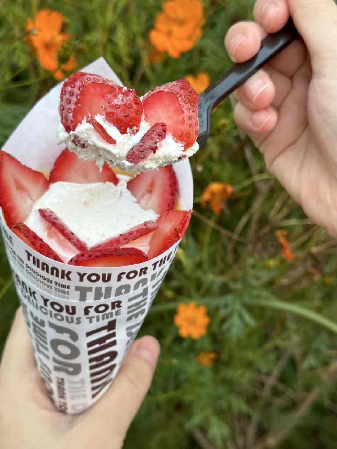 「幸せを呼ぶブーケ」は真上から見ると、クリームに乗ったスライスしたいちごが花びらのよう。冷凍庫から取り出して少しかためのままでも美味しく食べられ、食べ進めるとだんだん溶けて通常のクレープのような柔らかさになります。甘すぎないクリームはとろける食感で、甘酸っぱいいちごが絶妙にマッチした本格派スイーツです。より美味しく食べられるように味にもこだわっており、クリームは5種類、プレーンのホイップクリーム、塩キャラメル、カスタード、チョコカスタード、チョコレートから選べます。口コミなどで人気となり百貨店の催事に呼ばれることも増え、行列ができてすぐに品切れになる会場もあります。