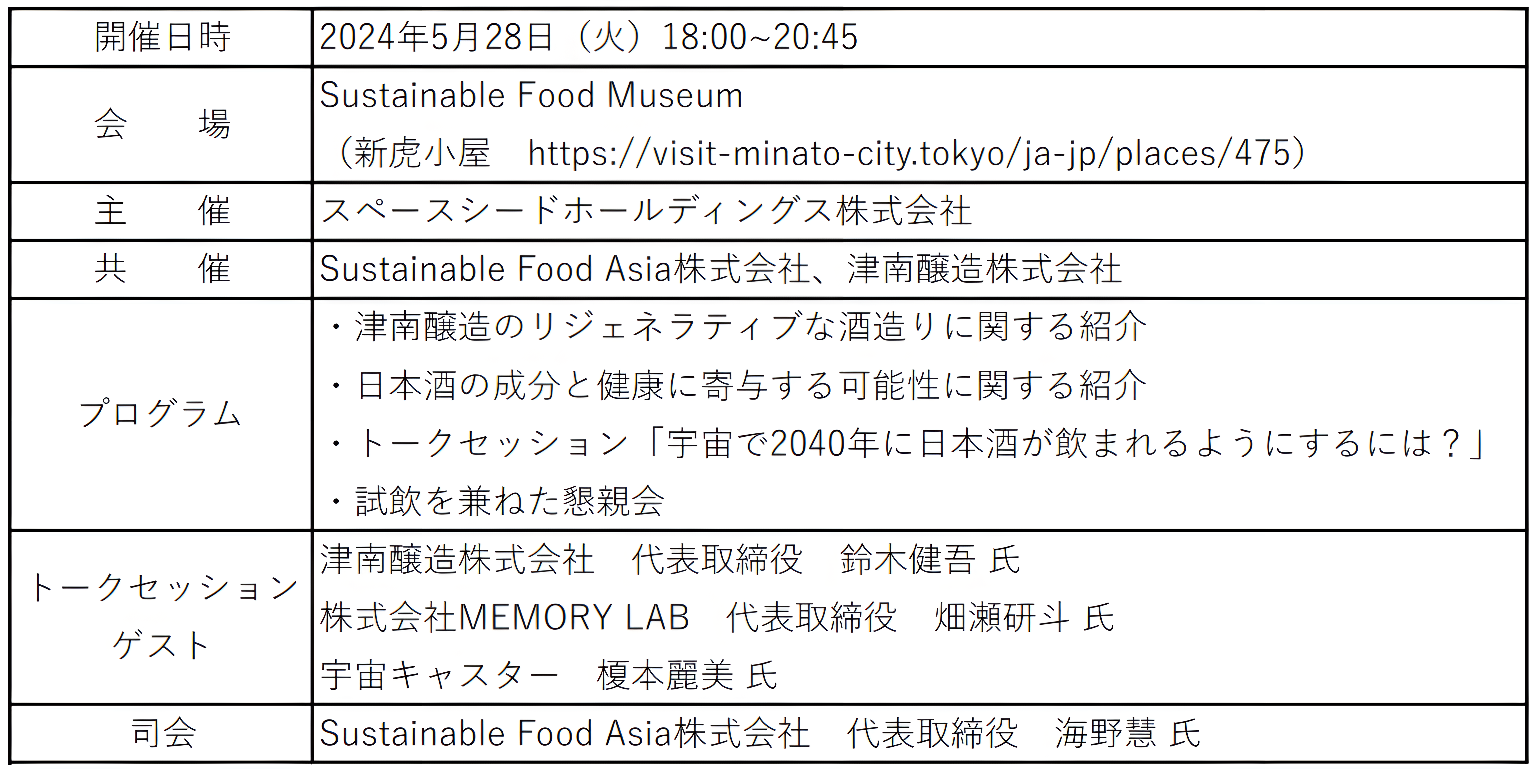 スペースシードホールディングス株式会社(本社:東京都港区、代表:鈴木健吾、以下「スペースシードホールディングス」)は、Sustainable Food Asia株式会社と津南醸造株式会社との共催で、2024年5月28日(火)に虎ノ門で、日本酒と健康の関係性を考えるイベント「Sustainable Sake NIGHT 2024」を開催したことを報告します。
