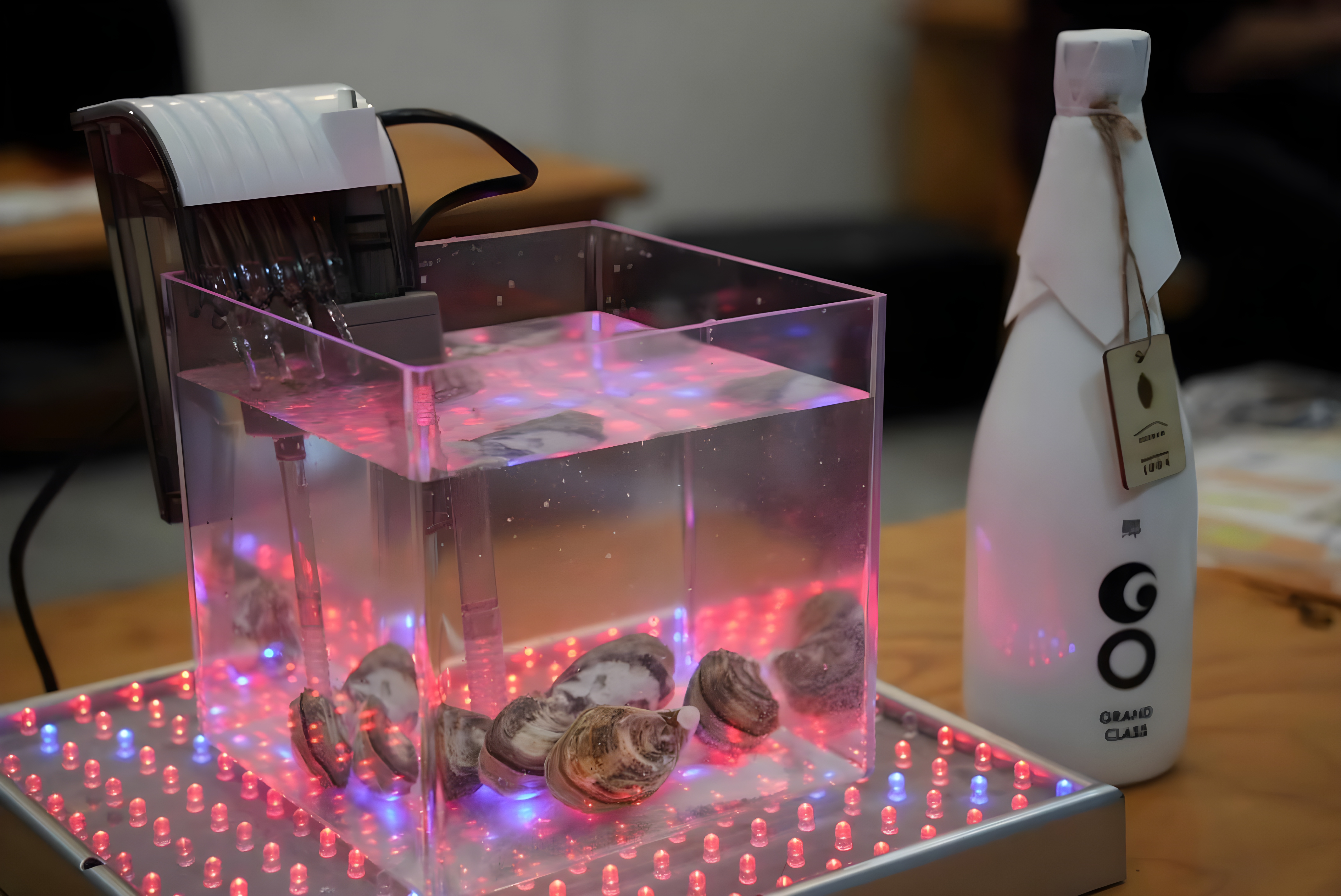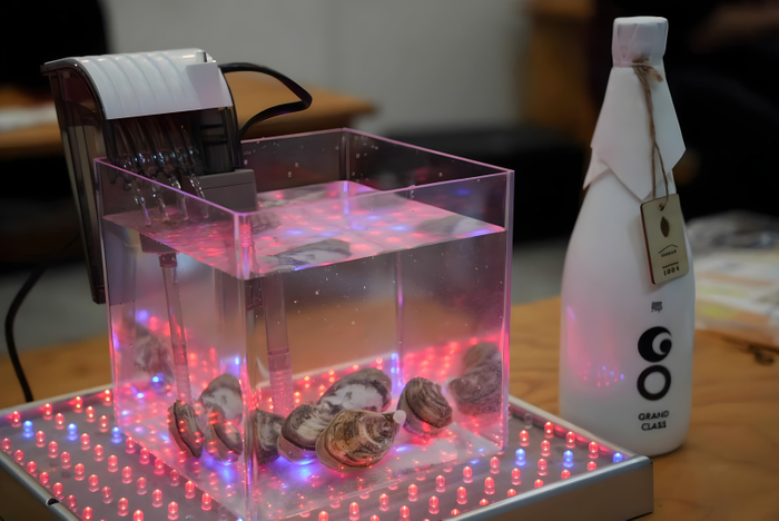 会場で大きな注目を集めたのは牡蠣でした。宇宙養殖の観点から、宇宙で牡蠣を育てて米関連の粒子を牡蠣に吸わせる実証例として、米麹を牡蠣に取り込ませる様子が展示されていました※1。また、牡蠣に合うお酒として、津南醸造の『郷(GO) dolce』などがふるまわれました。
