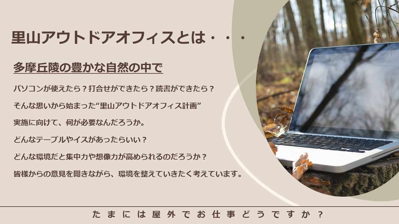 小山内裏公園と桜ヶ丘公園では、10月の対象期間中、ワーケーションやテレワークをされている方向けに、テーブルを用意して屋外オフィス「里山アウトドアオフィス」をお試しいただく実証実験を行います。