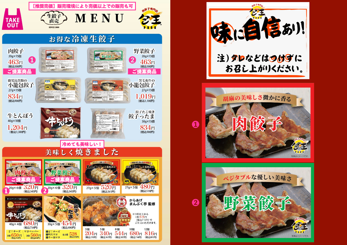 POP、のぼりなど販促品も用意されており、冷凍物販、(調理して)店舗メニュー・惣菜テイクアウト・デリバリー等、幅広い販売が可能です。強い商品力や、新たな売上を求める店主の方々にご使用いただければと考えています。