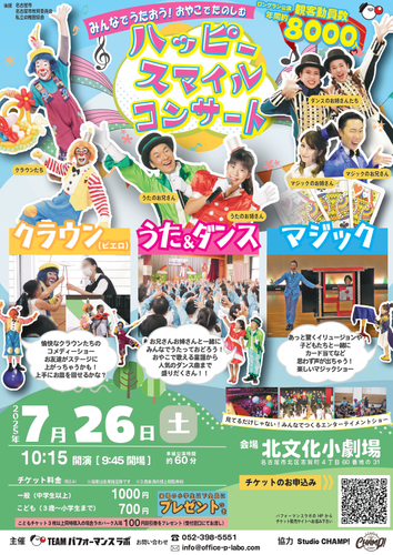 TEAMパフォーマンスラボ主催、みんなでたのしむ!おやこでうたおう!!『ハッピースマイルコンサート』が2025年7月26日 (土) に名古屋市北文化小劇場(愛知県名古屋市北区志賀町4-60-31)にて開催されます。