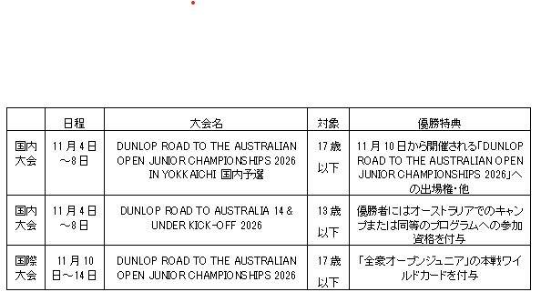 「DUNLOP ROAD TO THE AUSTRALIAN OPEN JUNIOR CHAMPIONSHIPS 2026 in Yokkaichi」国内予選(17歳以下)及び「DUNLOP ROAD TO AUSTRALIA 14 & UNDER KICK-OFF 2026」(13歳以下)/11月4日~8日