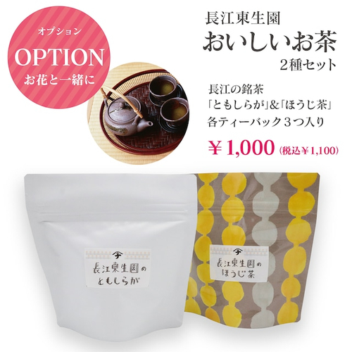 お花と一緒にご注文できるオプションとして、長江東生園様(富山市)のおいしいお茶(2種類セット)もご用意しております。美しいお花とおいしいお茶で、心やすらぐひとときを贈りませんか。
