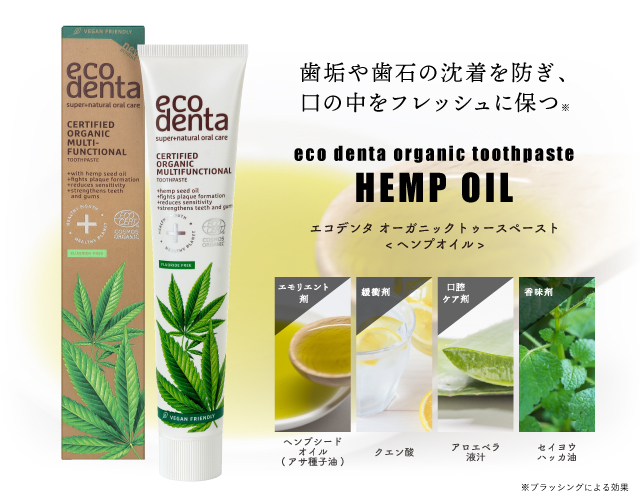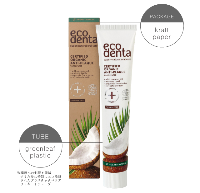 「eco denta オーガニック トゥースペースト」は、自然の力で生産された有機・オーガニックの品質を保証する、フランスに本部を置く有機認証機関「エコサート」の認証を取得したオーガニック・ビーガン基準の歯磨き粉です。