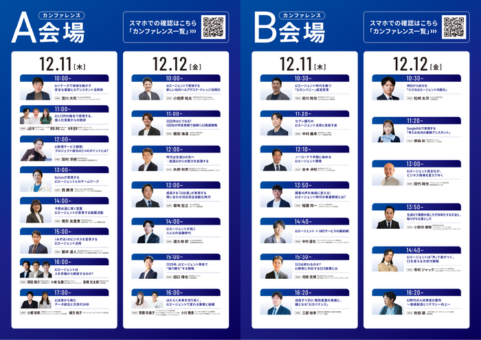 国内最大級のAIポータルメディア「AIsmiley」を運営する株式会社アイスマイリー(東京都渋谷区、代表取締役:板羽 晃司)は、最先端AIが集結する次世代技術の祭典「AIエージェント博 by AI博覧会」を2025年12月11日(木)~2025年12月12日(金)の2日間、御茶ノ水ソラシティカンファレンスセンター2Fで開催します。本日、カンファレンス登壇者全34名と会場フロアマップを公開しました。