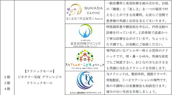 本施設には、1階にスーパーマーケット「阪急オアシス宝塚南口店」、2階~4階にクリニックモール「ジオタワー宝塚 グランレジス クリニックモール」が入居します。