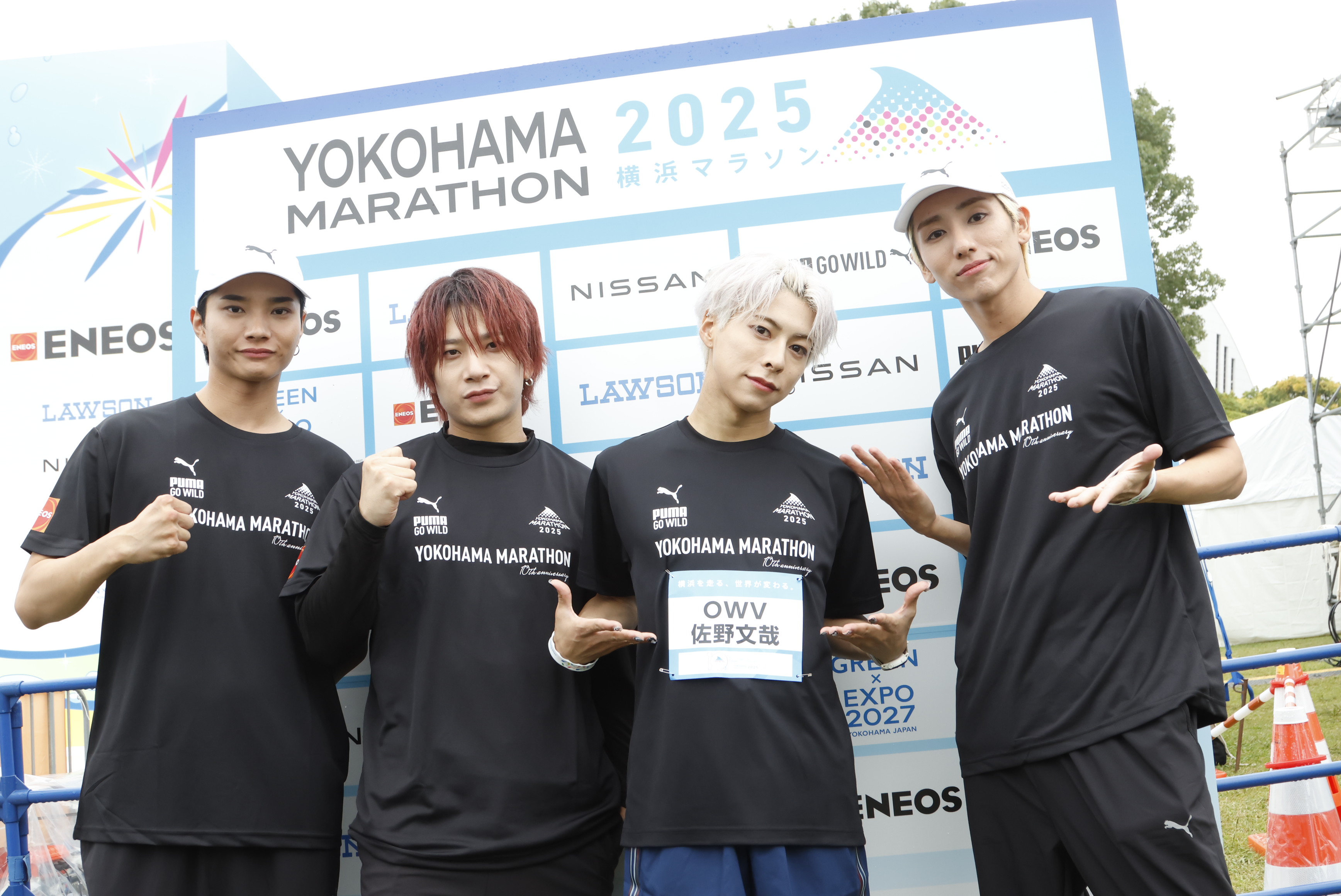 「横浜マラソンTV」の中継でたすきリレーを行ったのはOWV。メンバー4人でリレー形式でフルマラソンを完走し、途中、横浜の街の魅力も番組内でしっかりと伝えてくれました。第一走者の浦野秀太さんは「スタート地点は『やっちゃうぞ!』みたいな熱気がすごかったですね。アナウンスとか空砲みたいな煙も出てて、祭り感があって楽しくスタートが切れました」と語り、「沿道の方々が大声で応援してくれて、素敵なファンの方がいっぱいいるなぁっていうのも感じました。かっこいいところをみんなに見ていただけたかなって思いますね」と語って、第二走者を務めた中川勝就さんにマイクをバトンタッチ。「今回はみんなでタスキを繋いでいくということもあって、マラソンの楽しさを別の角度から知れたような気がしました。仲間がいるっていうのはやっぱり大きいなって思います。一人で参加しようって考えてる方がいらっしゃったら、お友達とかと一緒に参加するっていうのもオススメです」と振り返り、マイクは第三走者の本田康祐さんへ。「打ち合わせの時から『第三走者が一番大変だよ』っていうのを聞いてたんです。僕もツラかったんですけど、周りを走ってるランナーさんたちも焦燥してて、そんな方たちを盛り上げられたらなと思って、声出しながら走りました。少しでも元気になってくれたらいいなって気持ちでしたね」「高速道路はツラいんですが、走れる機会なんてなかなか無いので、高速道路に入る瞬間はめっちゃワクワクしました。現実っぽくない経験でしたし、漫画みたいな世界で、これはこれでいい経験になりました」と、大変な高速道路パートでの様子を語ってくれました。アンカーを務めたのは佐野文哉さん。「僕の担当するコースは7kmぐらいだったのでプレッシャーもなく楽しく走ることができました! 景色も海が見えて、沿道で応援している方たちもフィニッシュに向けてどんどん盛り上がりが増してる感じが走っていても感じましたし、楽しかったですね」と走っている最中の気持ちを語り、「自分としてはそんなに疲れもなかったので、その分、フルマラソンでここまで頑張ってこられたランナーのみなさんの後押しができればいいな、パワーを分けられたらいいなという思いで、できる限りの笑顔と大声で力添えをさせていただきました」と、ラストスパートの時の気持ちも話してくれました。