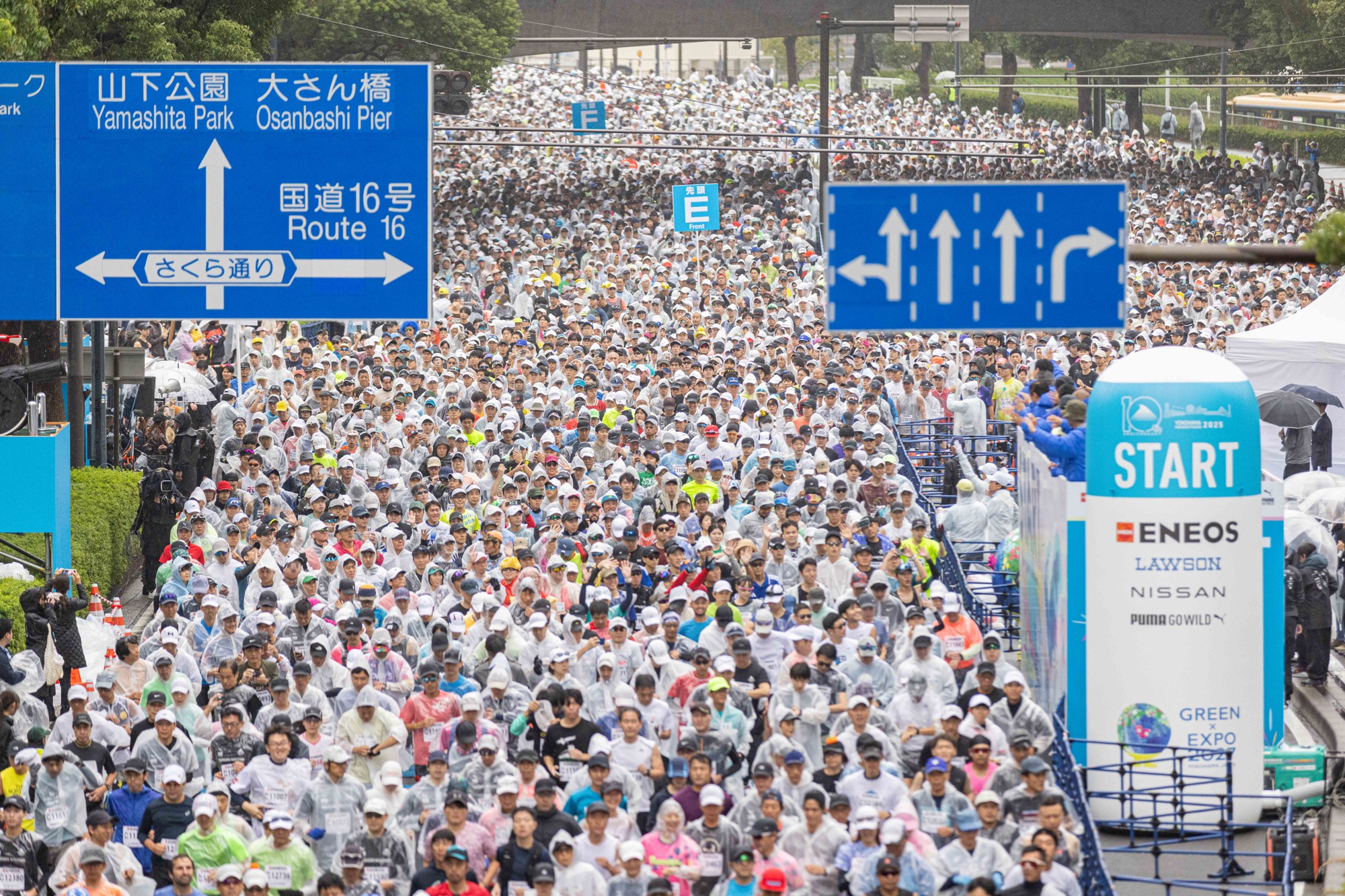 応援ゲストの谷原章介さんは「雨の横浜も乙なもんです。みなさんの熱気で吹き飛ばしてください。楽しんでね!」とランナーたちに声をかけ、スタートと共に、ゲストのアレックス・ラミレスさん(元横浜DeNAベイスターズ監督)、EXILE MAKIDAIさんをはじめ、八田秀雄さん、尾藤朋美さん、山﨑勇喜さん、信櫻空さんらが手を振って送り出しました。ラミレスさんはランナーから声援を受けて“ゲッツ!”ポーズで応えていました。スタート式には「GREEN×EXPO 2027公式マスコットキャラクター」のトゥンクトゥンクも登場。スタート後にはランナーたちに手を振ったりハイタッチをして応援しました。