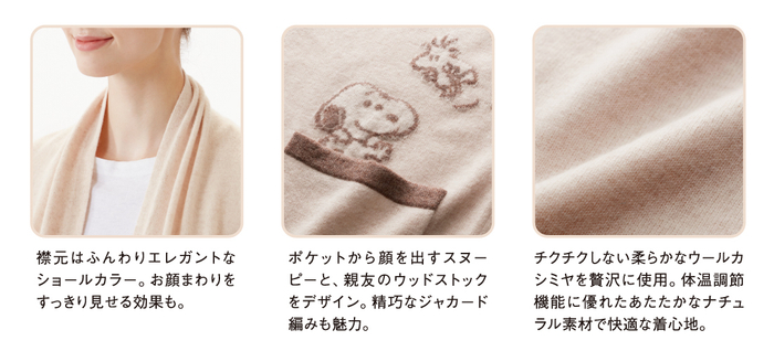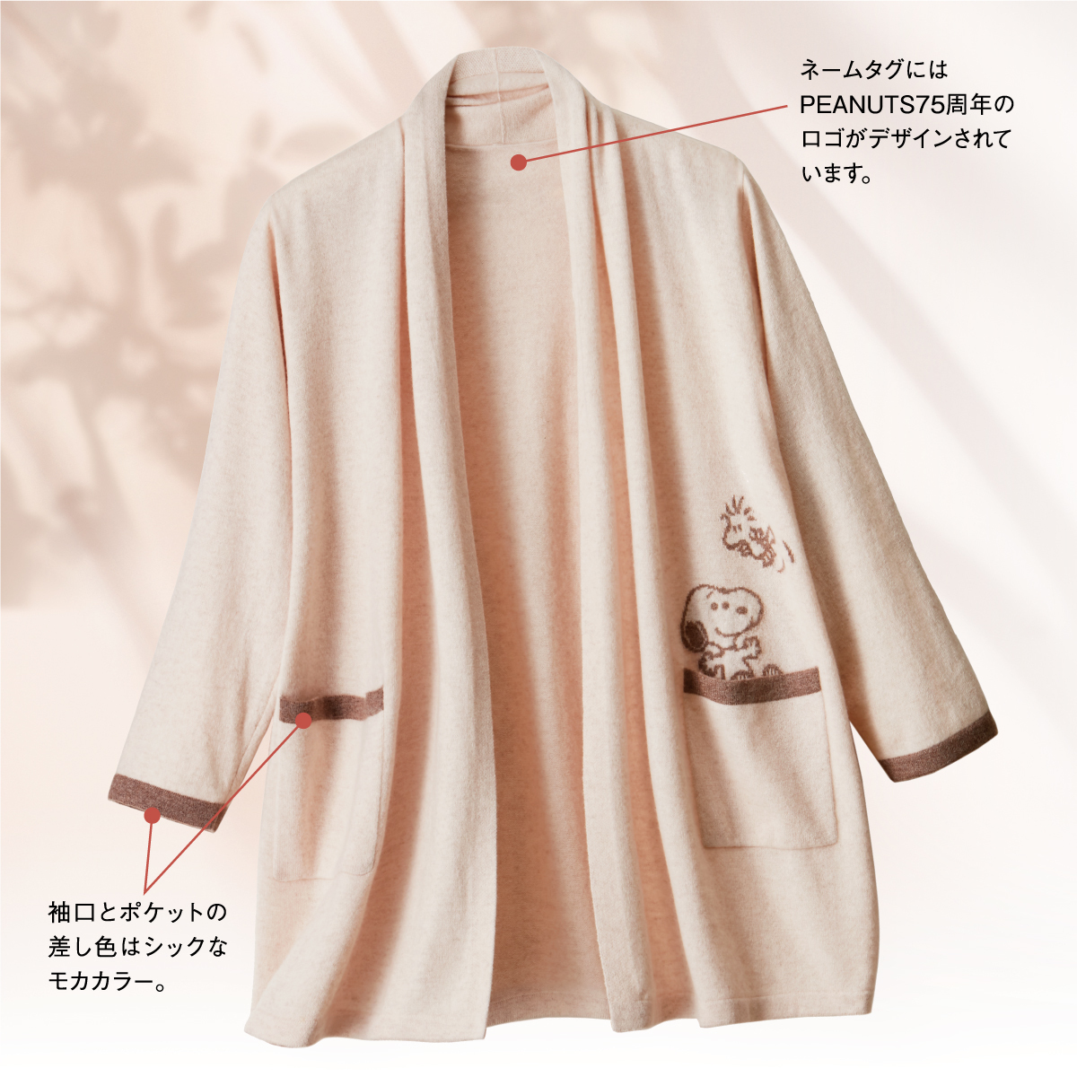 PEANUTSのコミック誕生75周年記念。<スヌーピー いっしょにお出かけ>ウールカシミヤのあったかコーディガン、新発売!