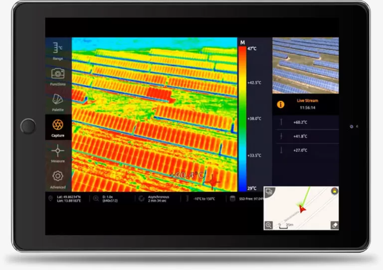 標準仕様では測定温度範囲-40 ℃~+550℃、640×512ピクセル解像度を提供。高解像度モードでは1,266x1,010ピクセル、測定精度0.05℃(50mK)、1-12倍デジタルズーム付のサーマルカメラとナイトビジョン付光学30倍ズーム付RGBカメラ(1,920×1,080ピクセル)、16万画素 広角RGBカメラを搭載しています。
