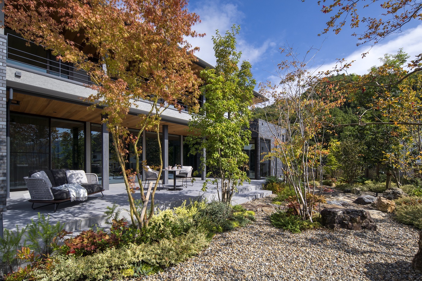 その別荘のオーナーであるI様夫妻。複数の住まいを所有していることから、別荘を建てる場所として、自宅から気軽に行き来ができる緑豊かなロケーションを求めて、自宅から車で30分ほどの距離にある大阪郊外のニュータウンを選びました。
