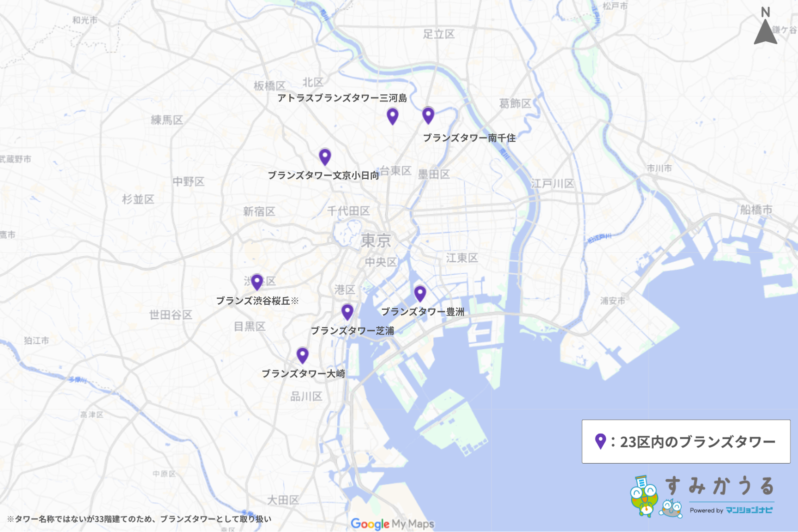 街の発展とともに資産価値の上昇が期待できる豊洲、芝浦、大崎など、湾岸・副都心の再開発エリアが中心です。2026年1月時点で23区内のブランズタワーは7物件(※33階建てのブランズ渋谷桜丘を含む)と数が限られており、その希少性の高さも特徴の一つです。