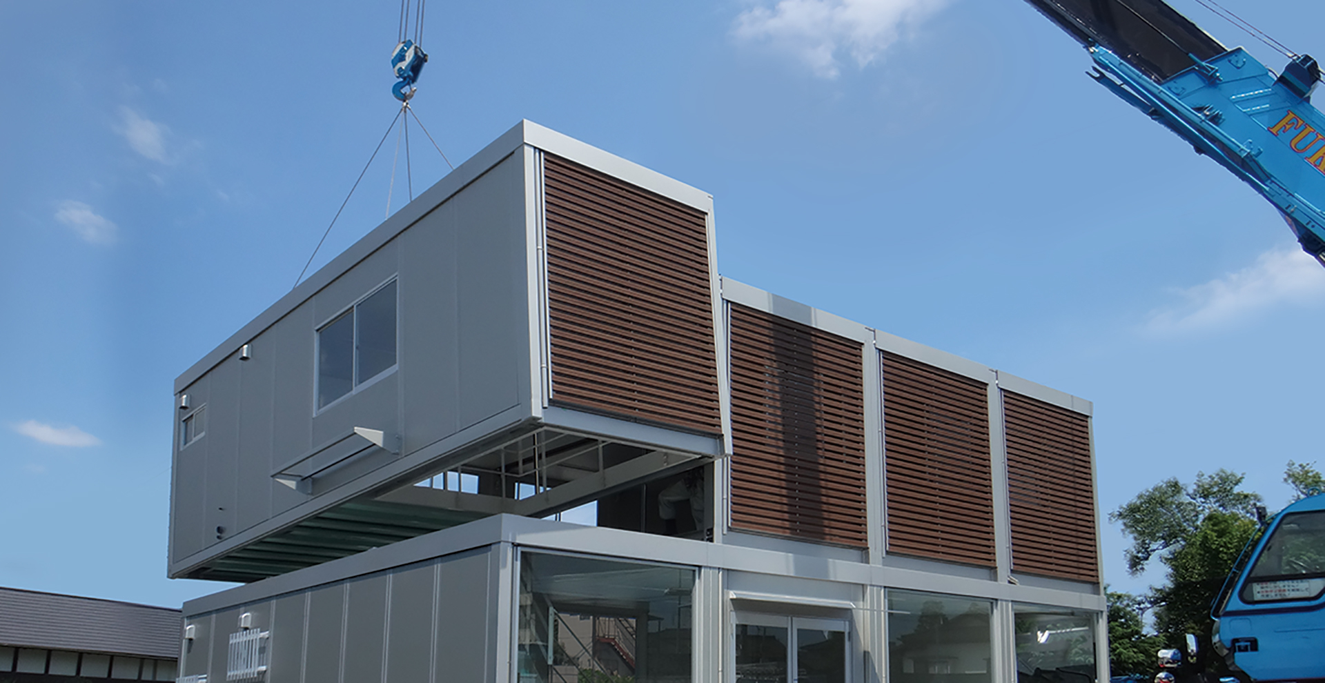 モバイルスペースとは、工場で生産した箱状のフレームを、現場で連結するだけの簡単作業によって建設できる製品です。