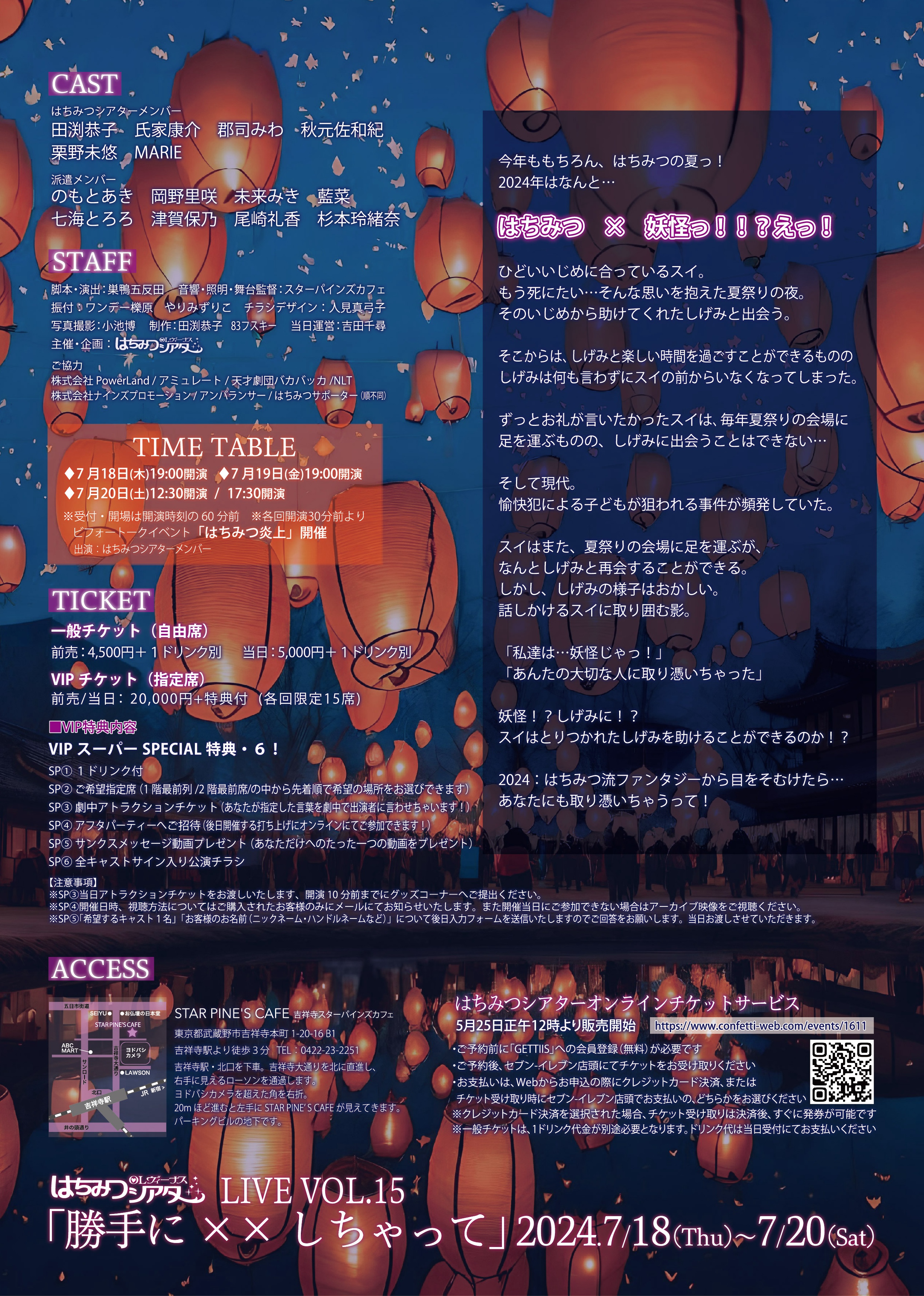 はちみつシアター主催、LIVE VOL.15『勝手に××しちゃって』が2024年7月18日 (木) 〜 2024年7月20日 (土)に吉祥寺STAR PINE’S CAFE(東京都 武蔵野市 吉祥寺本町 1-20-16)にて上演されます。