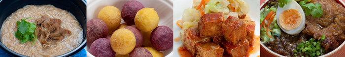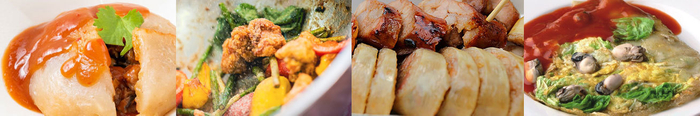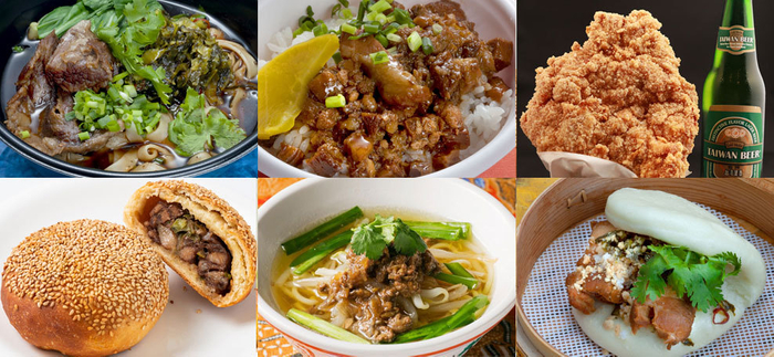 とろとろでコクのあるスープで食べる麺料理「台湾麺線(ミエンシエン)」、芋の餡が入ったもちもち食感の「QQボール」、名物クサ旨グルメ「炸臭豆腐(ザーチョウドウフ)」、スパイスを効かせた衣をつけ揚げたポークリブ料理「排骨飯(パイクーファン)」、ご飯に乗せた鶏の胸肉に香辛料の効いた醤油タレがかかった「鶏肉飯(ジーロウファン)」など。