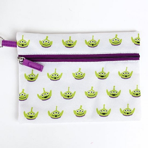 Mサイズには、エイリアンがチラシ柄になっています。パープルのファスナーもきれいですよね。