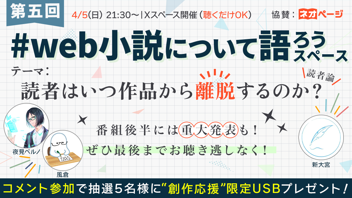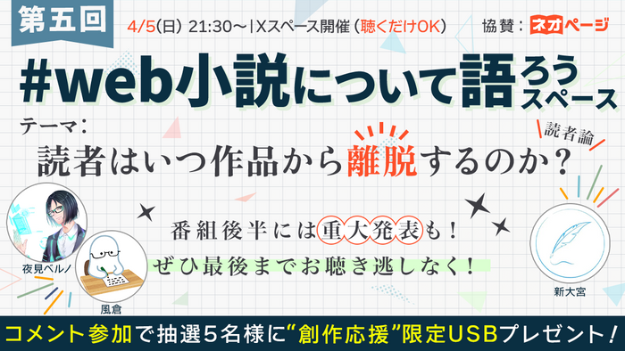 Web小説の「離脱」の境界線はどこにある?音声番組『#web小説について語ろう』第5回放送にネオページが協賛。4月5日(日)21:30より開催