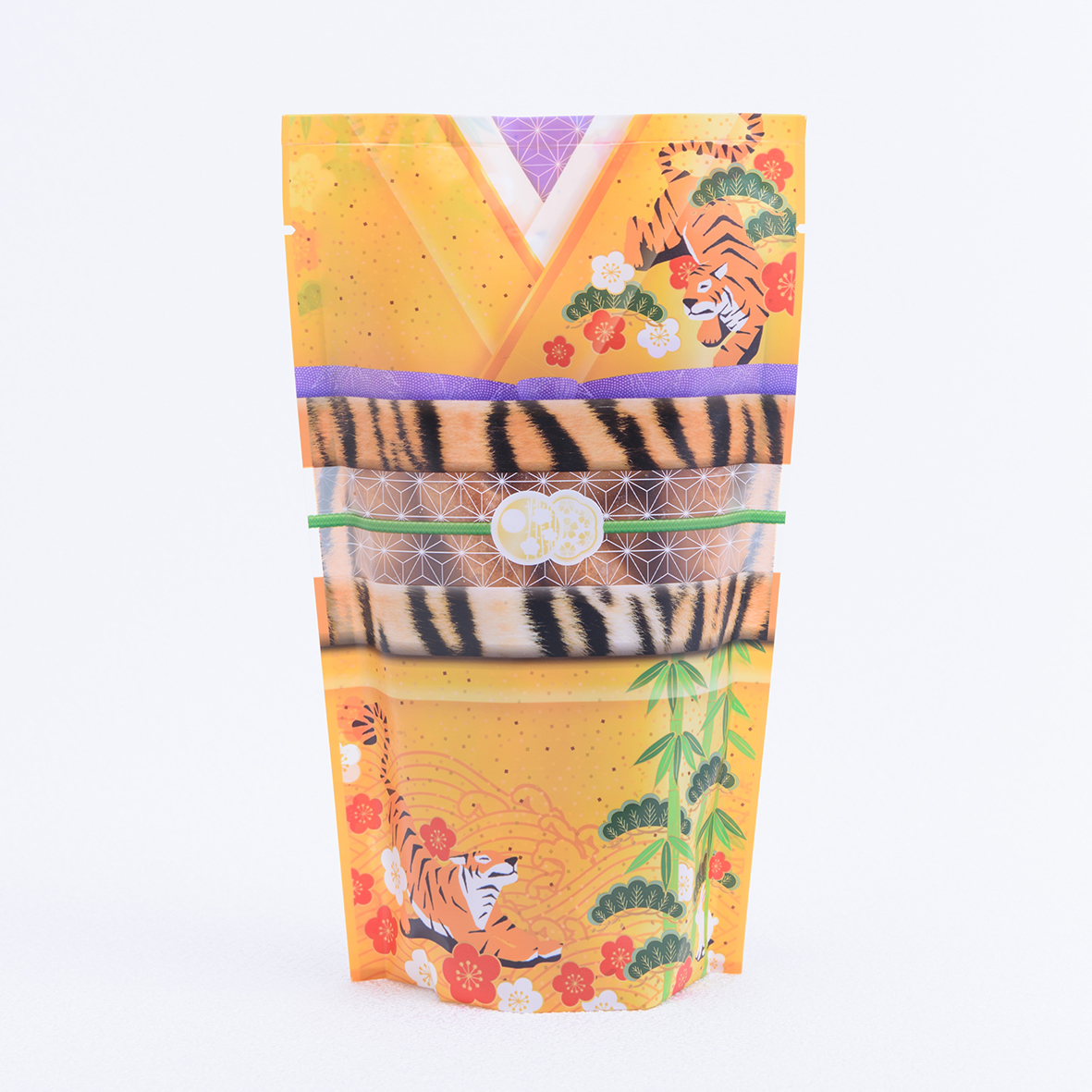 お正月らしい金色を基調にした着物のパッケージには2021年の干支である「寅(とら)」やおめでたい「松竹梅」のイラストが描かれています。帯の部分も寅模様になっていてインパクトも◎。年末年始の手土産や御年賀にぴったりなデザインです。