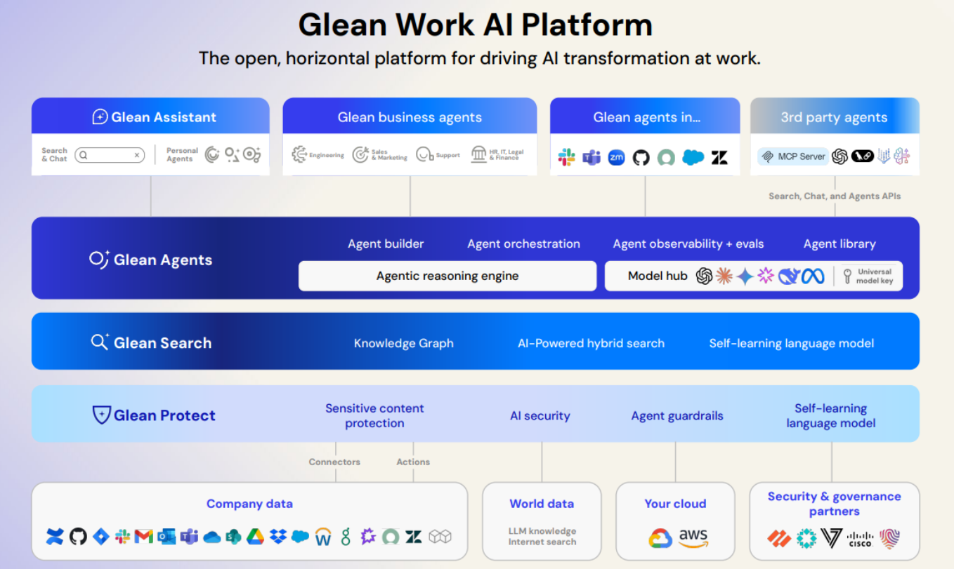 Gleanは、企業内の分散情報を統合し、AIで業務効率を向上させるエンタープライズ向けプラットフォームです。主要なSaaSアプリケーション100種以上との連携により、社内データを瞬時に検索・活用でき、情報のサイロ化やAI活用スキルのばらつきを解決し、組織全体でAIネイティブな働き方を実現します。