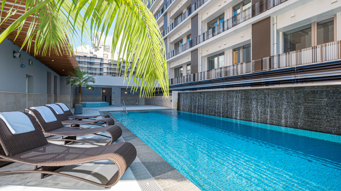 『ホテルアクアチッタナハ』は、那覇の港町・泊エリアに位置する、スタイリッシュで開放感のある都市型リゾートホテルです。那覇空港から車で約15分、離島への玄関口「泊ふ頭旅客ターミナルビル(とまりん)」も徒歩すぐと、島旅の拠点としても人気です。最大の特徴は屋上のシースループール。日中は青空を、夜はライトアップされた幻想的な空間を楽しめ、水中ではまるで幹線道路の上を泳いでいるかのような非日常体験が味わえます。朝食では地元の食材を使用した地中海ビュッフェを提供しており、利用者から高い満足度を得ています。