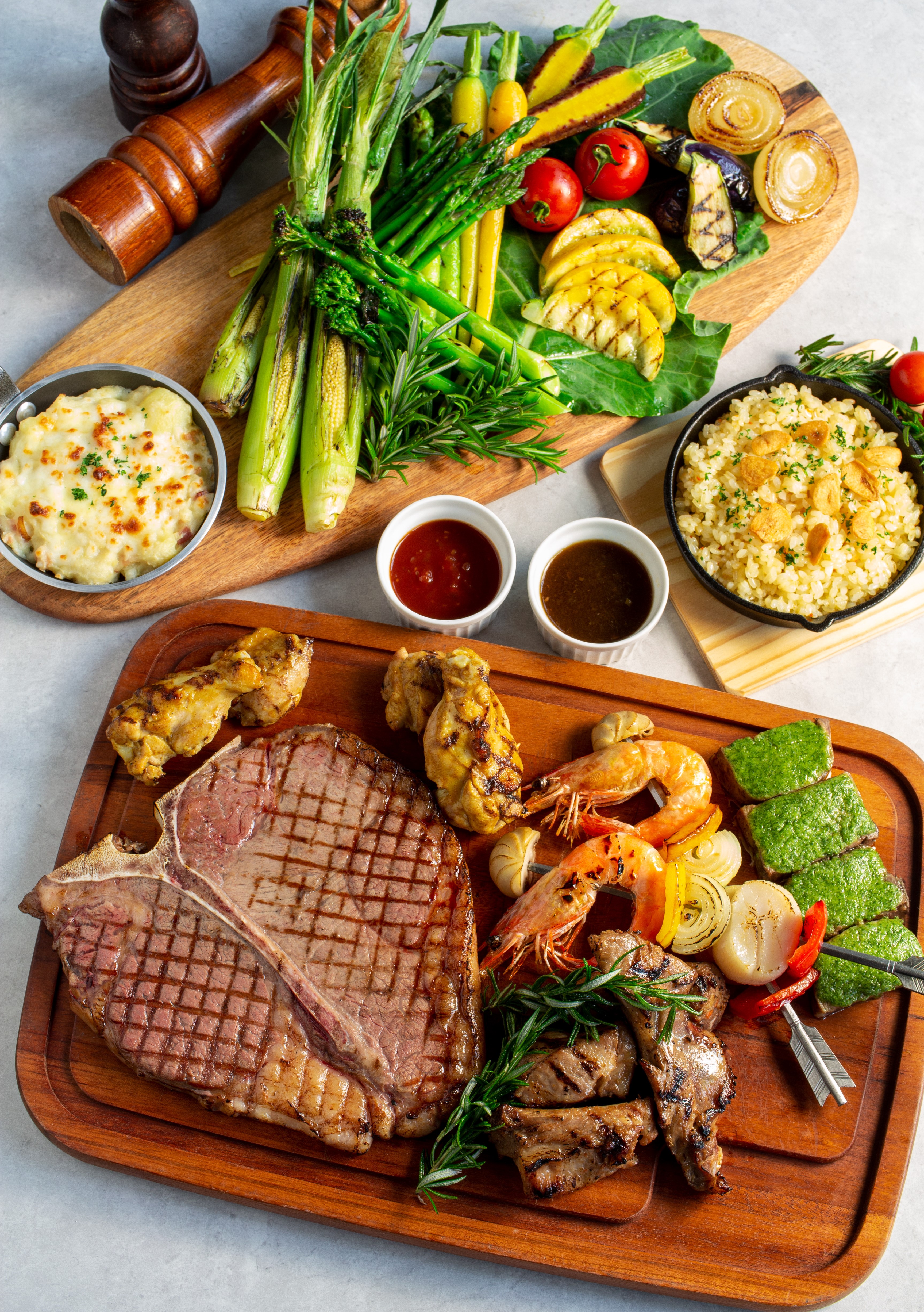 T-Boneステーキ・オリジナルスペアリブ・アマデウス特製カレーでマリネしたタンドリーチキン・厚切り牛タンのコンフィ・ブルギニオン・シーフードブロシェット