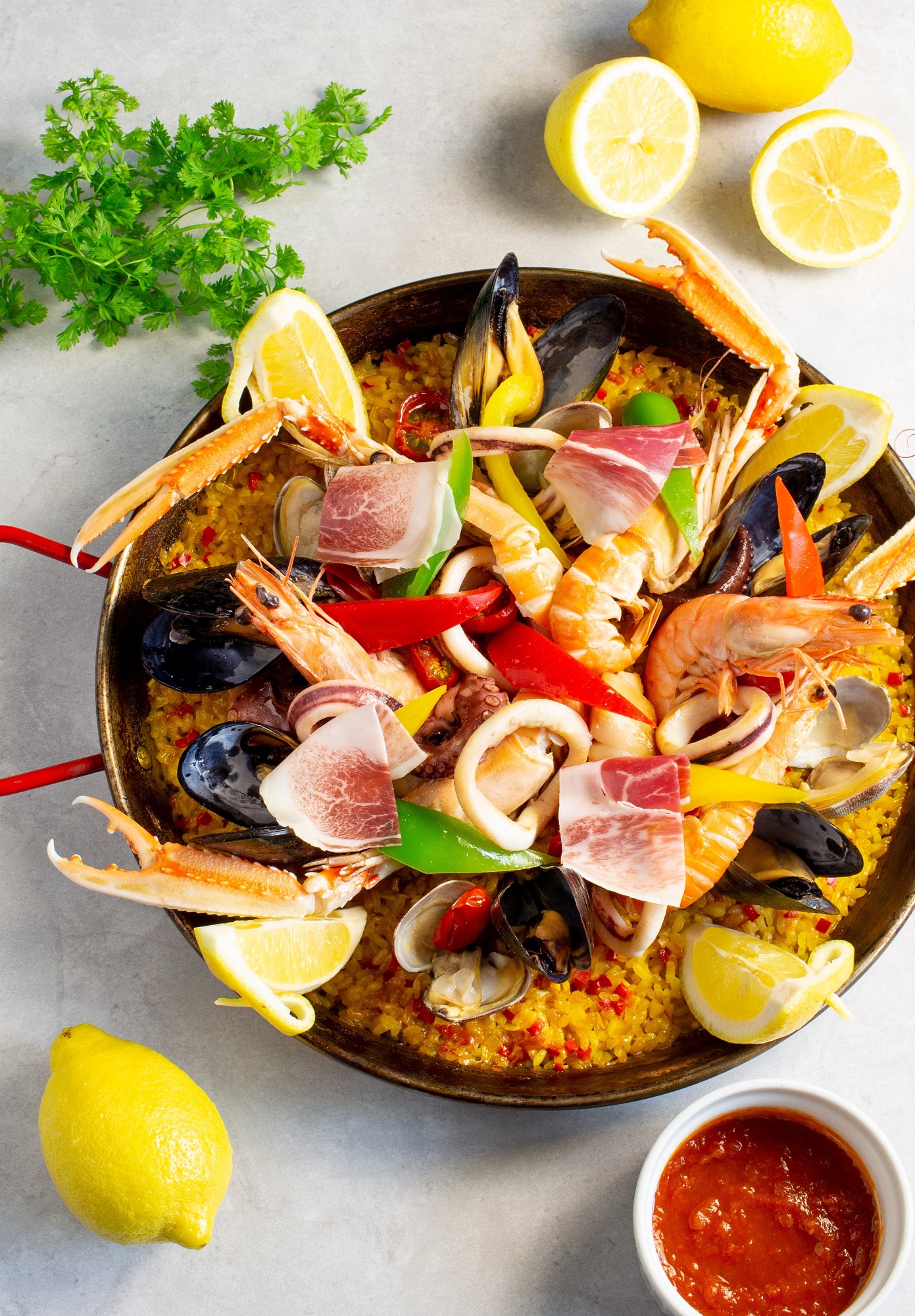 米(国産米)、炊飯用パエリアストック(スープ)、仕上げ用ソース、ヨーロッパ産ラングスティーヌ、天使の海老、帆立貝柱、たこ、するめいか、ムール貝、あさり、パプリカ、セミドライトマト、ハモンイベリコ、フレッシュハーブミックス、レモン
