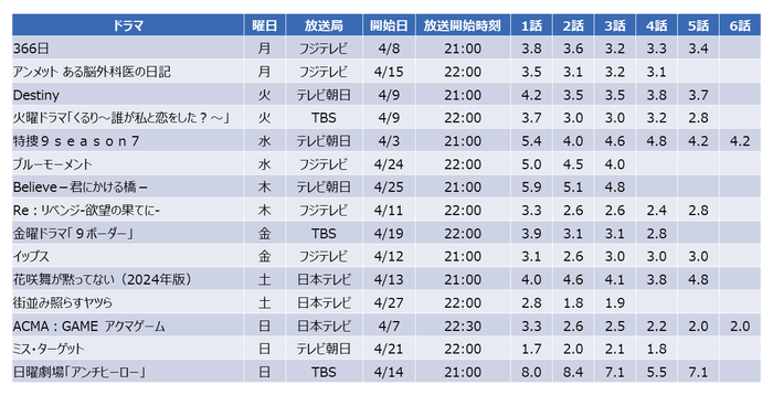 今回は、2024年4月以降にスタートした春ドラマの中で、関東地区の21時台・22時台に放送されている15作品を分析。各話の視聴率や属性別の視聴率について結果をご紹介します。