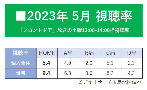 2023年5月の月間平均個人全体視聴率5.4%、世帯視聴率9.4%を記録し、同時間帯でいずれも1位(ビデオリサーチ調べ、広島地区)を獲得しています。