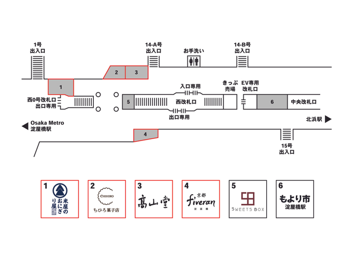 今回開業の3区画も全てテイクアウトの食物販業態で、「米屋のおにぎり屋 菊太屋米穀店(おにぎり・弁当等)」「ちひろ菓子店(焼菓子)」「髙山堂(和菓子)」というラインナップです。営業中の「もより市 淀屋橋駅」「SWEETS BOX 淀屋橋店」「京都 fiveran 淀屋橋(ベーカリー)」と合わせて、近隣オフィスワーカーの昼食時や帰宅時のご利用はもちろん、手土産需要の充足や、観光行楽の移動の合間に手軽に食事やおやつをお買い求めいただく等、お客さまのご利用シーンに合わせて、駅ナカでのお買い物の楽しさを提供いたします。