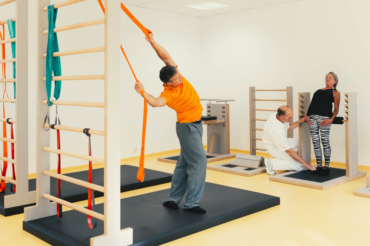 歩行のフィードバック後は、木製ストレッチ器具「five」を使った転倒防止の為のストレッチを個別指導する。