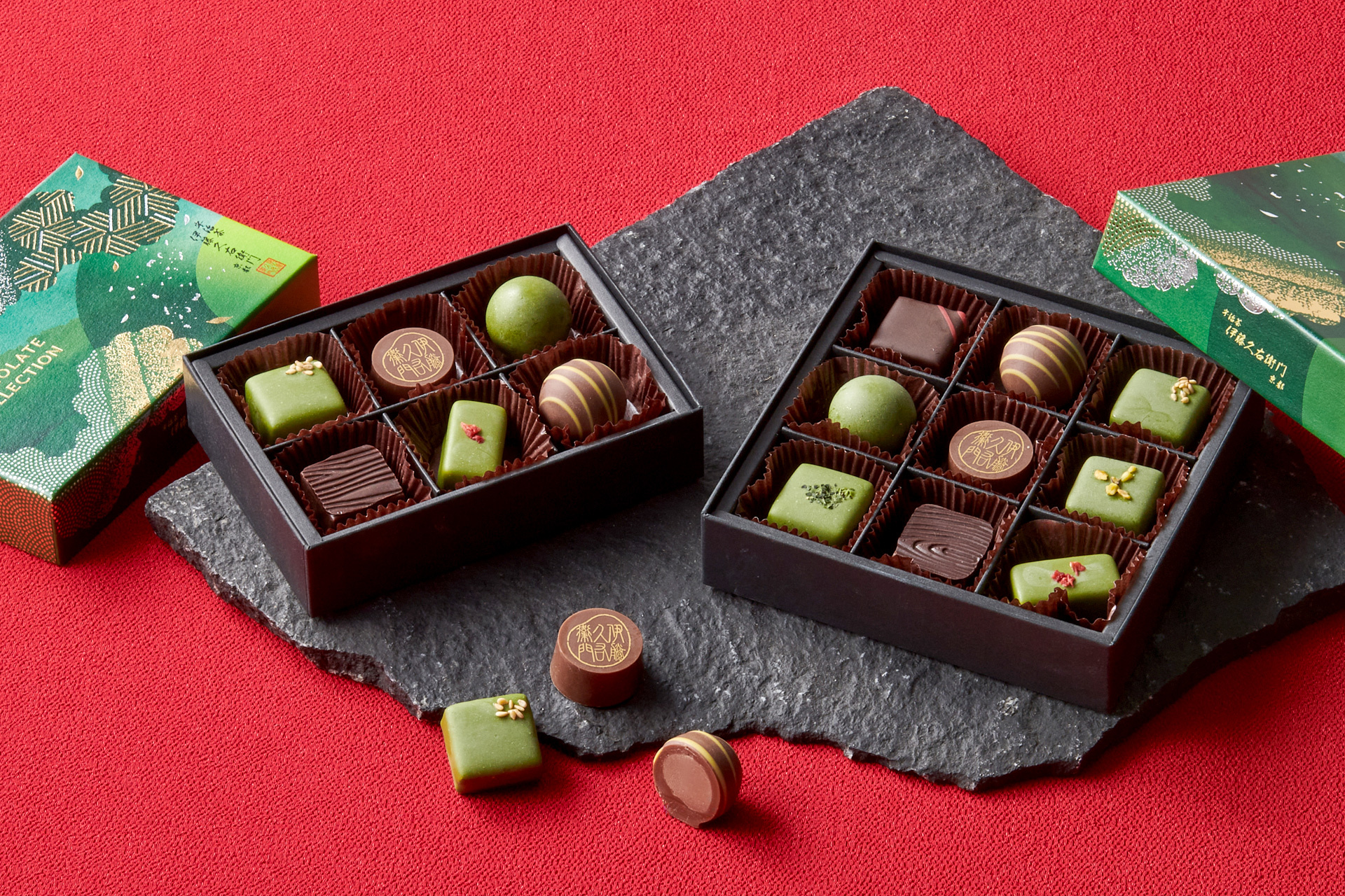 宇治抹茶と宇治ほうじ茶に、ごま・カシス・ピスタチオなど9種の素材を組み合わせたチョコレートギフト「ショコラコレクション2026」。バレンタイン・ホワイトデーだけでなく、冬のギフトにも使いやすい6種入と9種入をご用意しました。「インターナショナルチョコレートアワード(International Chocolate Awards)」アジアパシフィック大会にて金賞を受賞した「抹茶チョコ × 濃い抹茶(9種入限定)」や、新作フレーバー2種を含む伊藤久右衛門オリジナルのチョコレートギフトです。宇治の茶畑や緩やかに過ぎる情景をパッケージのモチーフにしました。日常の喧騒を離れ、ゆったりと流れる時間の中で、伊藤久右衛門がお届けする9種のチョコレートをお楽しみください。