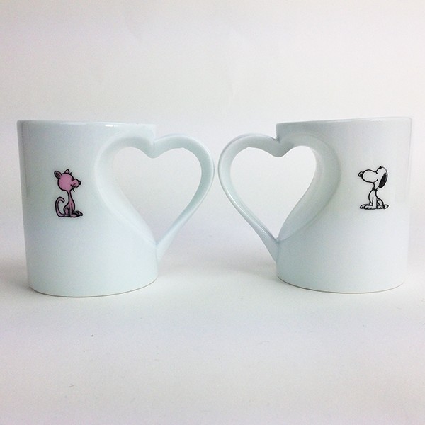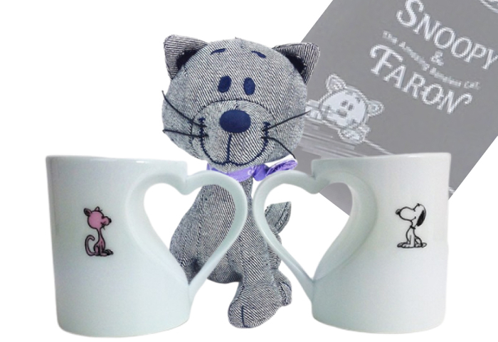 持ち手がハートになった、キュートなペアマグのセット♡スヌーピーとファーロンが、それぞれモチーフになっています。ホントはグレーのファーロンですが、ピンクなのもポイントです。