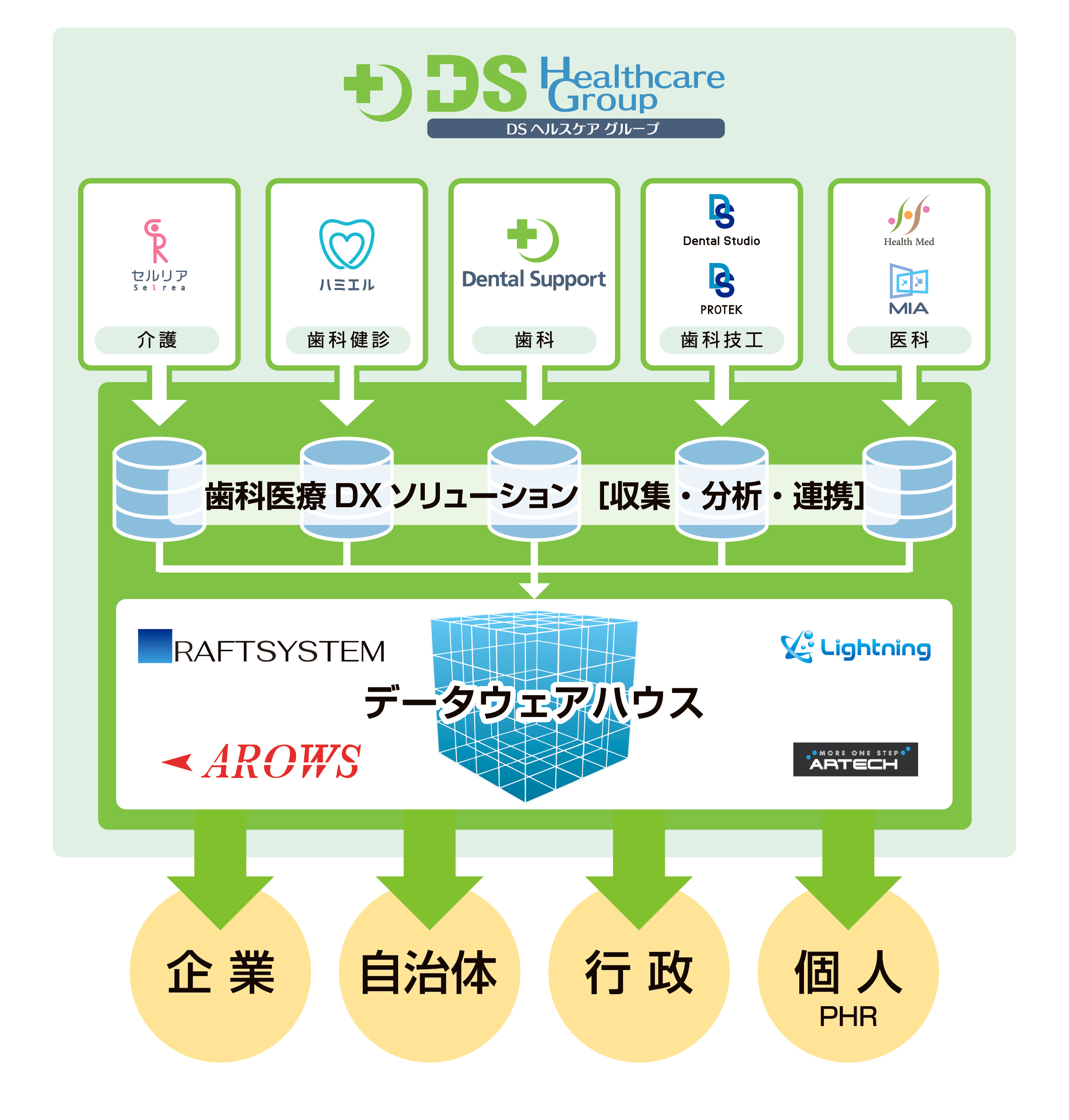 グループで歯科健診サポート事業を提供している「株式会社ハミエル」と共同して、数万人に及ぶ歯科健診結果をデータベース化することで、個々の医療データと連携するシステムの構築を目指しています。
