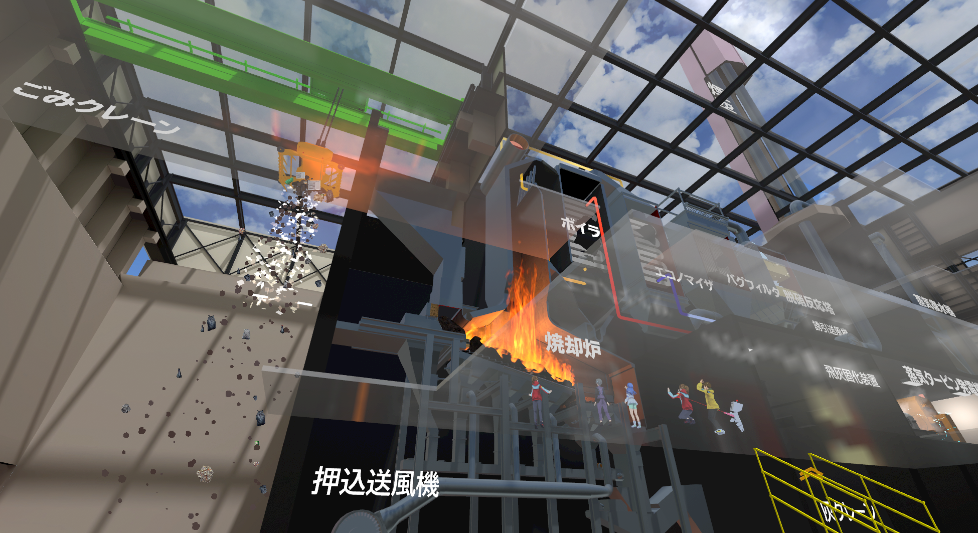 ごみがエネルギーに変わる「ごみ焼却発電プラント」のごみピットや焼却炉の断面から、陸から遠く離れた沖合にある「洋上風力発電」の巨大な風車の真下や、津波から街を守る「海底設置型フラップゲート」が眠る海の中まで。現実では立ち入ることが難しい場所から、社会を支える技術の仕組みを、誰もが安全に、探検気分で学ぶことができます。