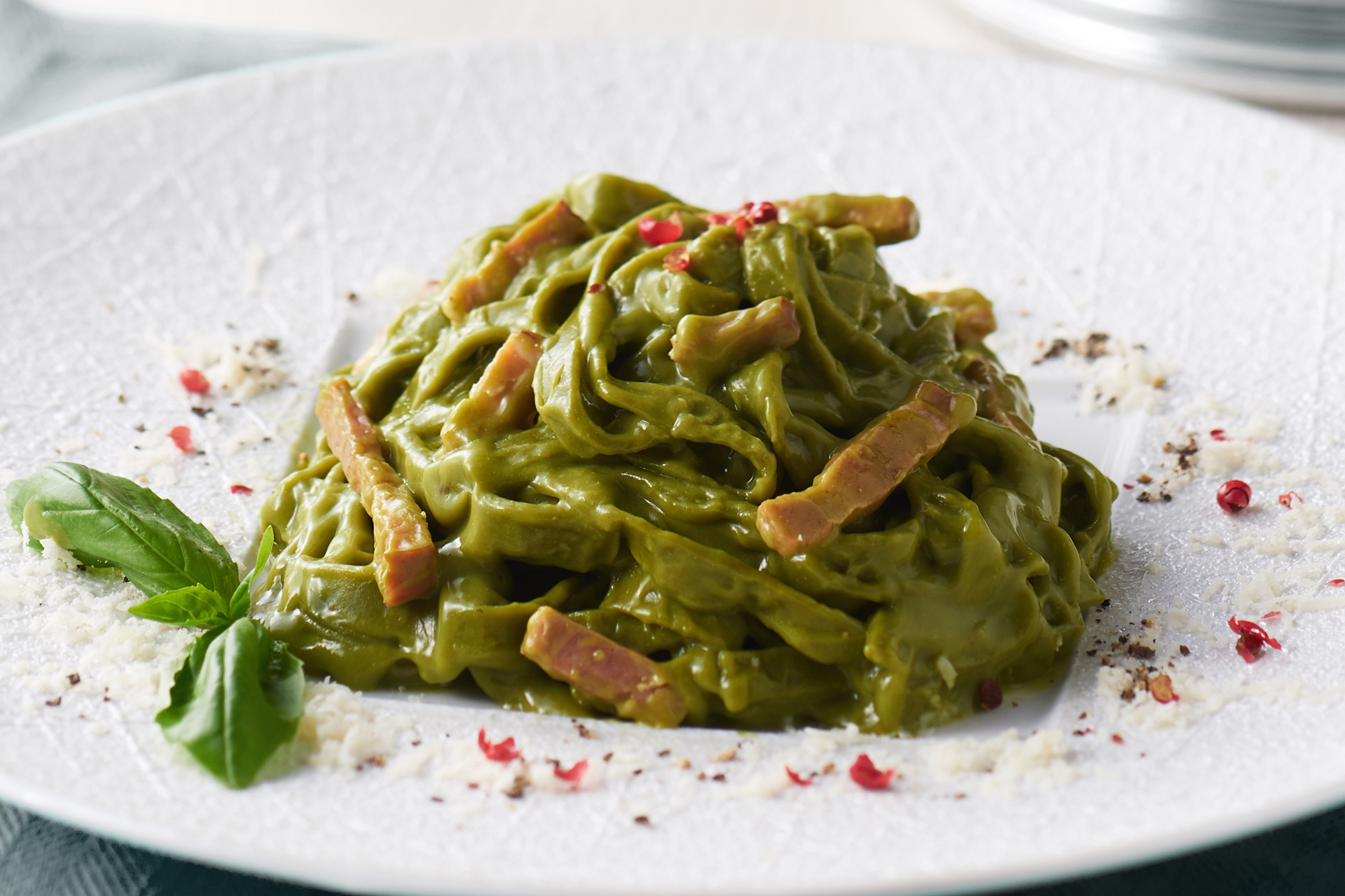 2種の小麦粉をブレンドした『宇治抹茶フェットチーネ』。小麦粉の選定と宇治抹茶の配合は、試作を何度も重ね、宇治抹茶の鮮やかな色合いと豊かな風味を実現。爽やかな宇治抹茶の香りとデュラム小麦特有のもちもちとした食感が楽しめるフェットチーネです。
