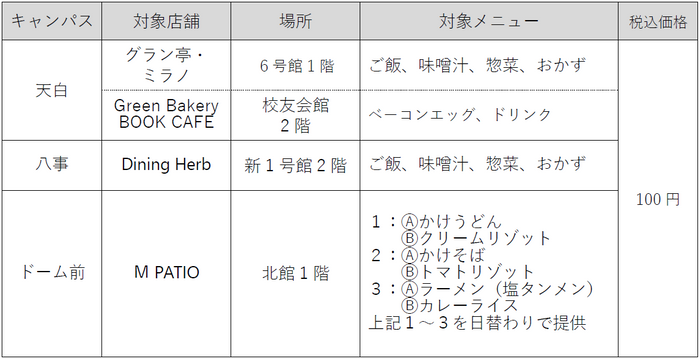 ・300円分のメニューを「100円朝食」として提供。差額の200円分は寄付金(名城大学教育振興資金)から補填。
