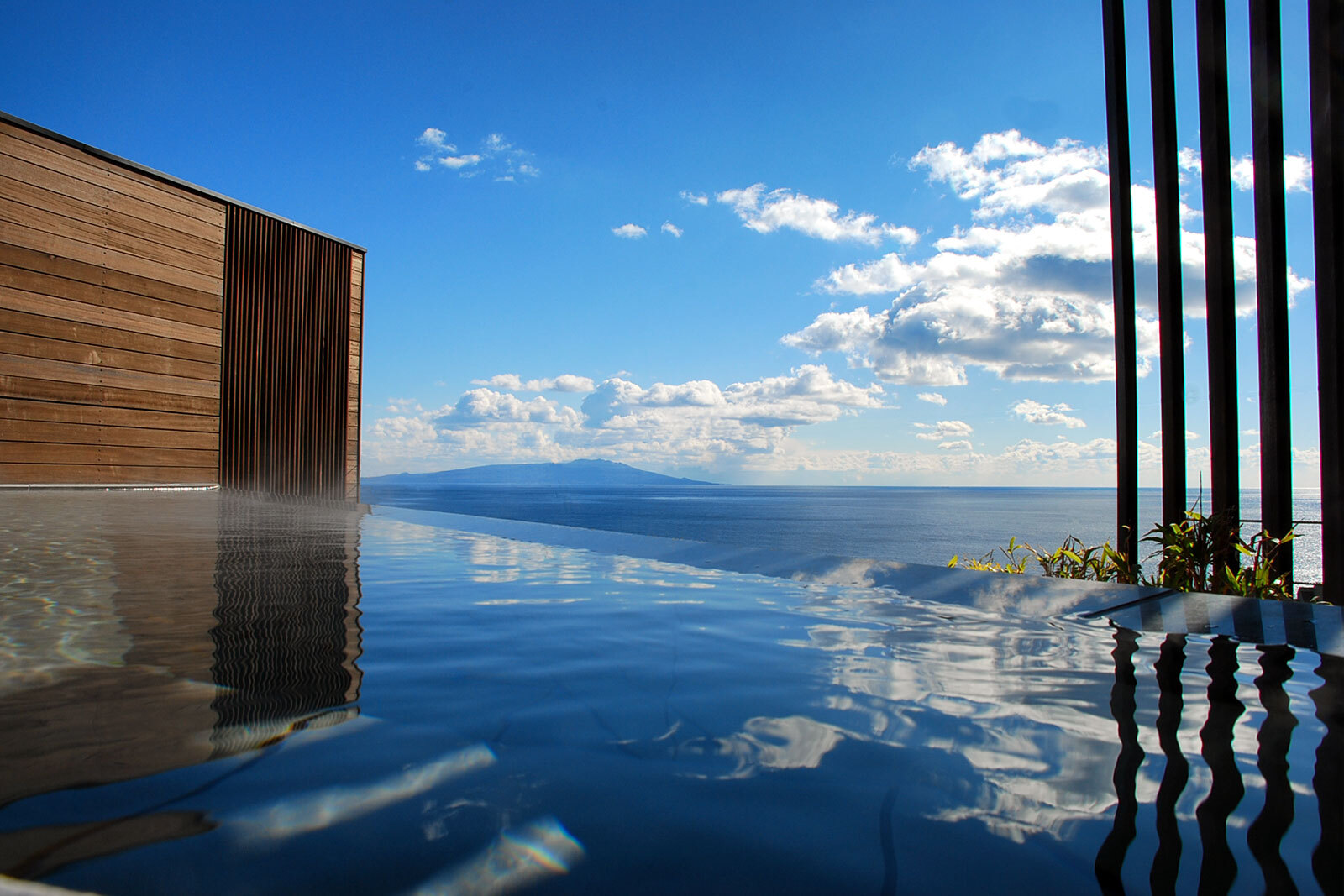 温泉が湧き出る街 - 伊豆熱川で当ホテルは高台に位置するため、雄大な海景色や湯けむりに包まれる温泉街を一望できます。屋上の『天空露天風呂』は「空と海と一体化」したような展望が自慢の絶景。満月の前後数日間は海面に月の光が描き出す「ムーンロード」の幻想的な光景も楽しめます。
