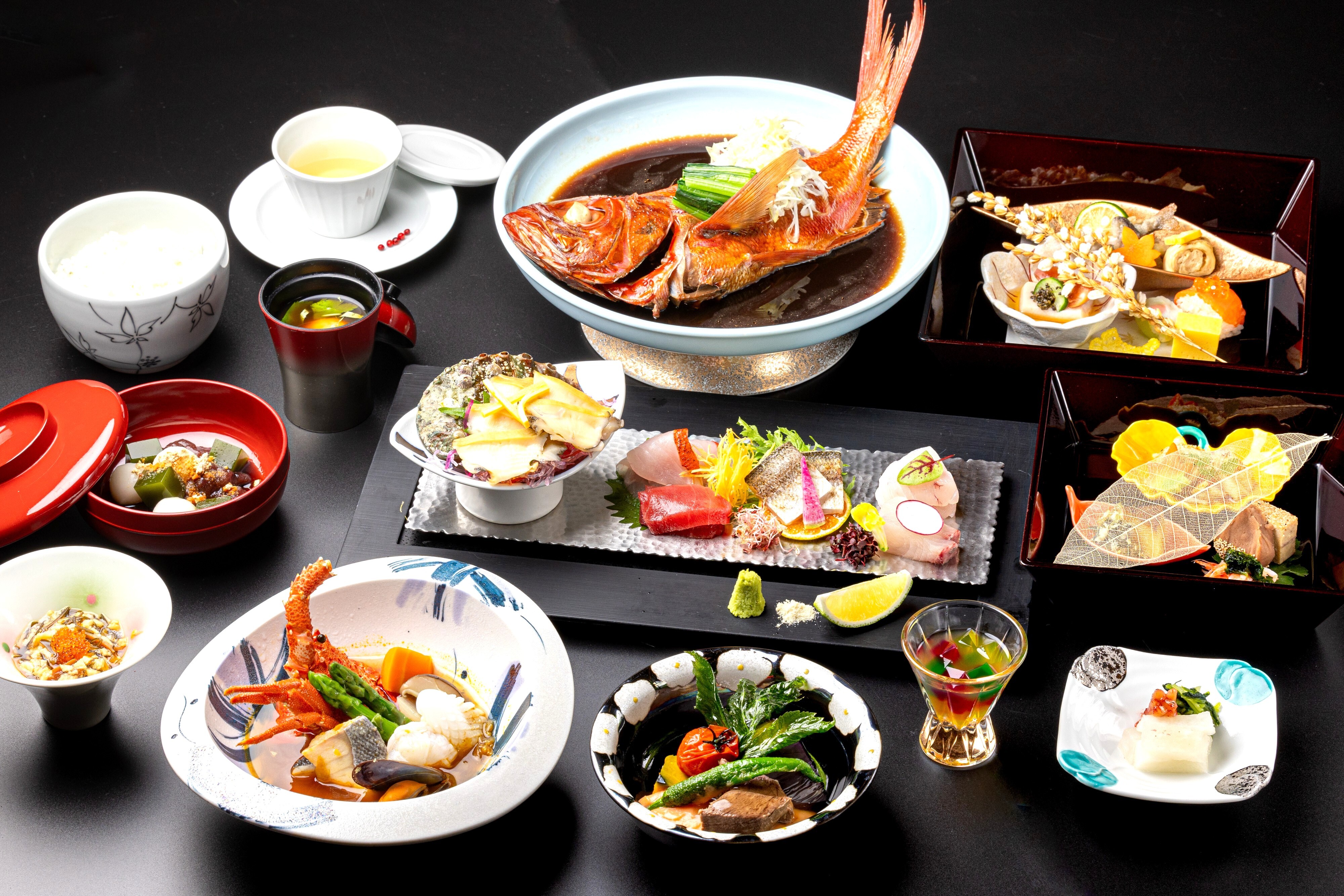 お食事は、伊豆で水揚げされた金目鯛や新鮮な魚介、伊豆の味覚や季節の食材を贅沢に使ったコース料理をご用意。伊勢海老・アワビ・和牛料理が楽しめる特選コースも人気です。