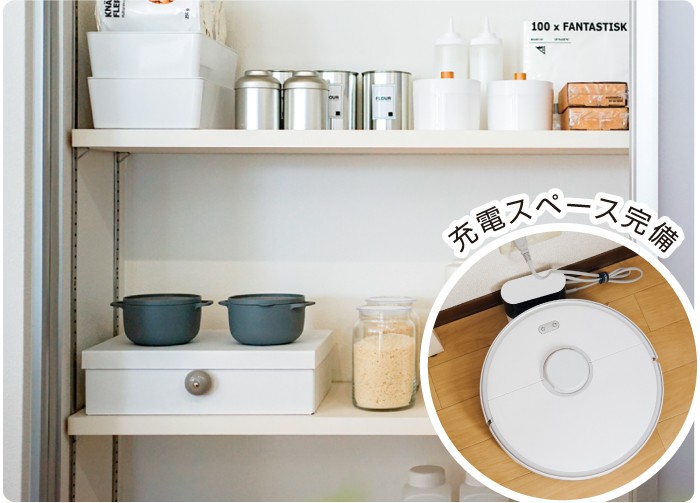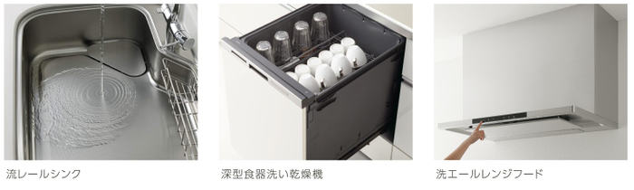 ファンフィルターを自動洗浄できるレンジフードやタッチレス水栓、洗剤自動投入機能付きの深型食器洗い乾燥機を採用。日々の家事負担を少しでも軽くし、家族の時間を豊かにするために、使いやすさと効率性にこだわったキッチンスペースです。