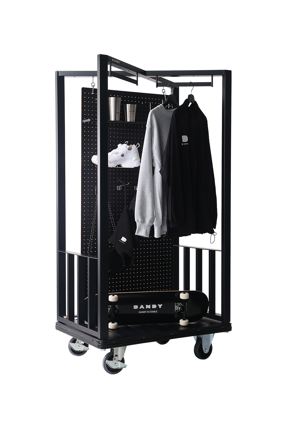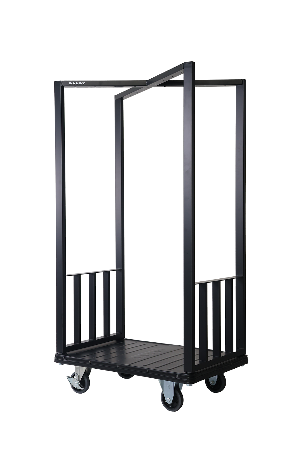 本製品は、「運ぶ」だけでなく「見せる」「使う」へと進化したカートです。最大の特徴は、上部に設けられたクロス構造。このクロス部分にはハンガーオプションを取り付けることで衣類やアイテムを吊り下げられ、さらに有孔ボードオプションを組み合わせると、展示スペースとして活用できます。荷台部分にはソファやテーブルを置くことで、簡易的な休憩スペースにもなり、ホテルや商業施設での使い方が大きく広がります。