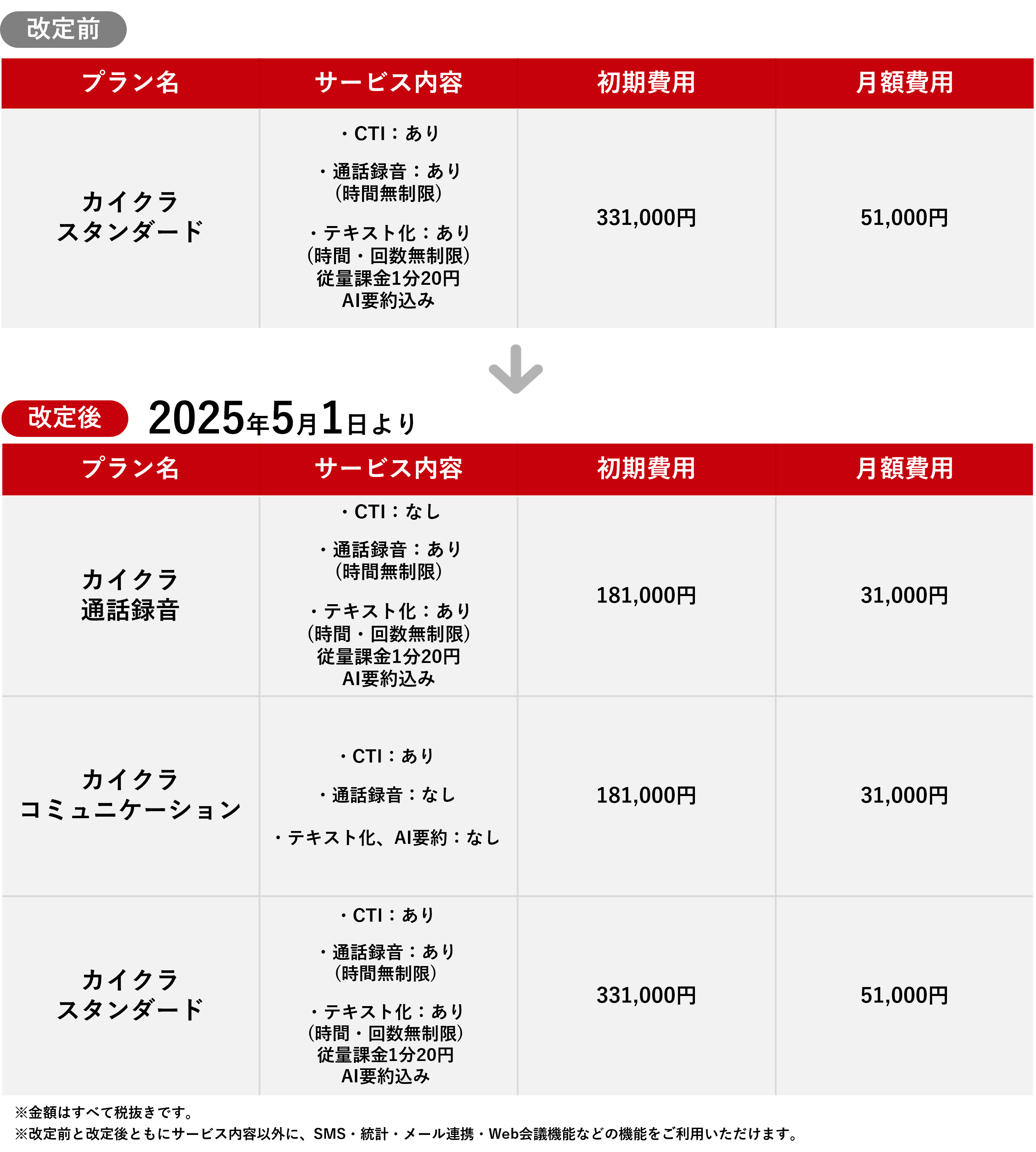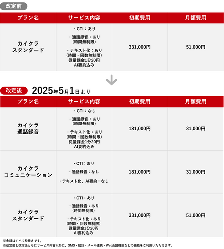 近年、企業と顧客のコミュニケーション手段が多様化し、業種や業態に応じた柔軟な対応が求められる中、喫緊の課題となっているカスタマーハラスメント対策をはじめとする企業側のニーズが急速に高まっています。こうした背景を踏まえ、より多くの企業がそれぞれの業務課題に合わせて「カイクラ」を選択・活用いただけるよう、この度、新たな料金プランの提供を開始いたします。