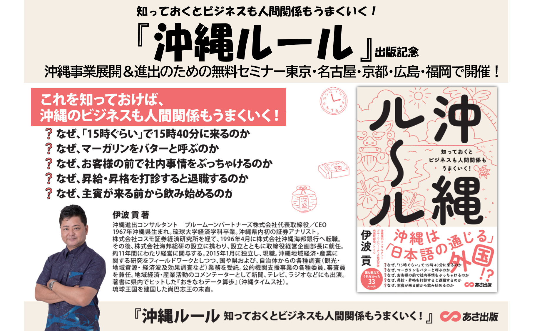 伊波 貢 著『沖縄ルール』出版記念 「沖縄事業展開&進出のための無料セミナー」東京・名古屋・京都・広島・福岡で開催!