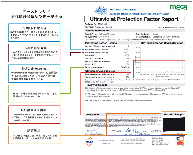 紫外線先進国のオーストラリアでも検査を行いUV-A波及びUV-B波の紫外線透過率は0.001%(ブラック生地)、黒より紫外線を通しやすい白い生地でも紫外線遮断率99.8%。