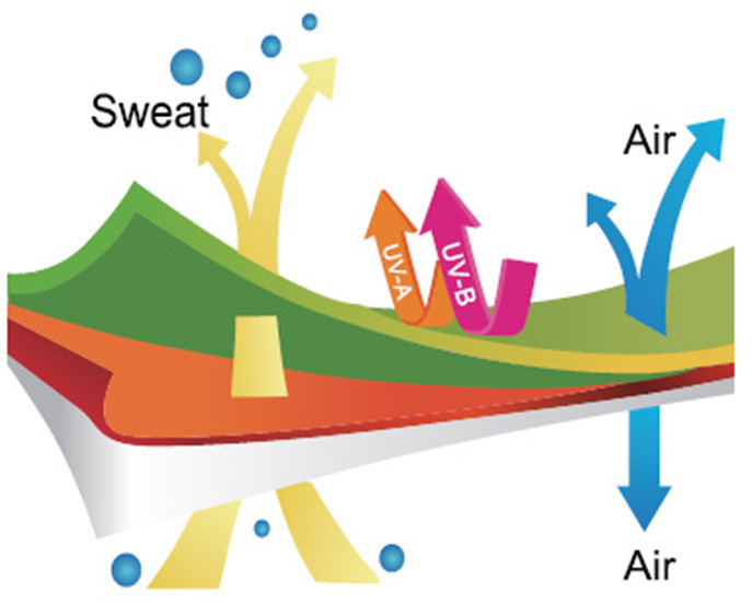通気性にも優れており風にあたると接触冷感機能でより涼しく感じることができ、汗をかくと熱移動が高いためより涼しく感じることができます。