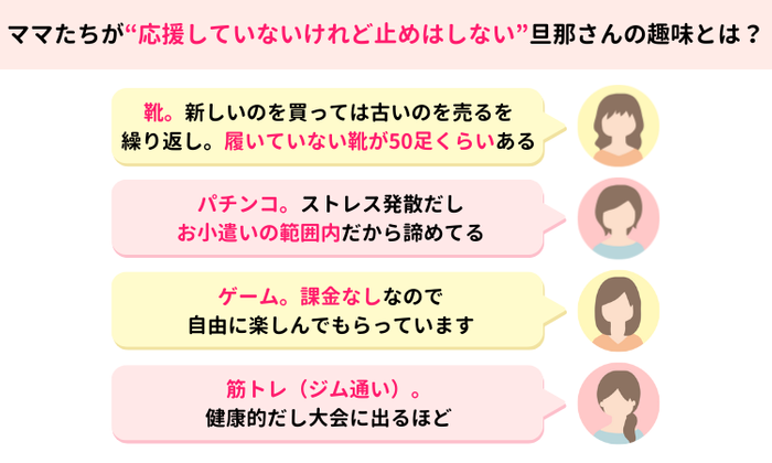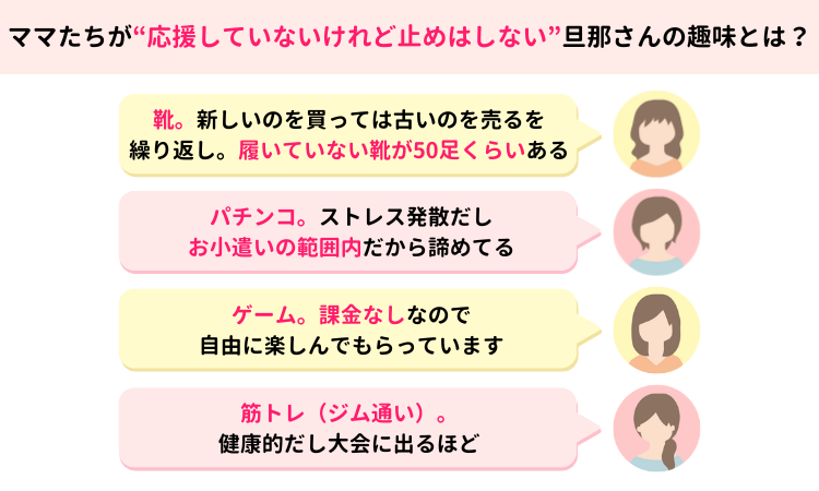 趣味の「内容」よりも、「時間の使い方」に対する不満が多く寄せられました。「乳児の双子と私を放ったらかしにして行っていたときは、何を考えているんだと思った」という声も聞かれ、家族を置き去りにして趣味に没頭するのはNGだということがわかります。