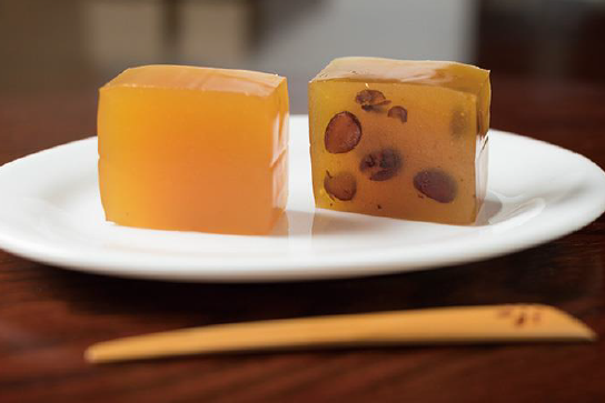 色鮮やかな琥珀色のいも羊羹。道南産大粒小豆「大納言」入り。
