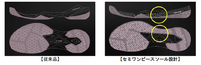 さらに「セミワンピース設計」も新たに採用し、踏付け部とかかと部の外側ラバーを一体化させることで接地面積が増大し、外側へのグリップ性と耐ねじれ剛性が向上。着地時の安定性を高めます。