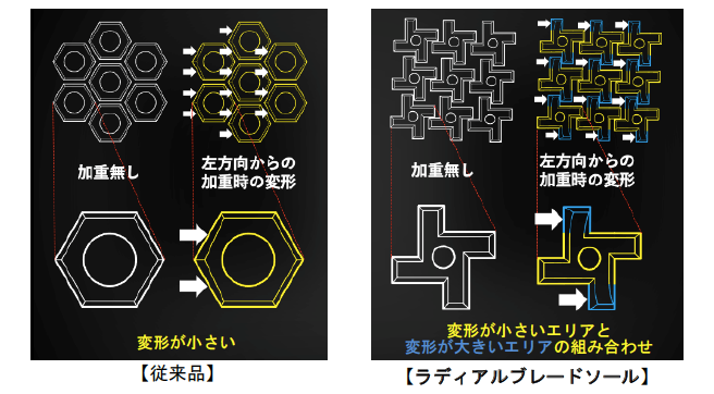 そこで今回、新たに開発した「RADIAL BLADE SOLE(ラディアルブレードソール)」をソールに採用(特許出願中)。変形の大きいエリアと小さいエリアを組み合わせることで縦、横、斜め方向へのグリップ性が向上しました。